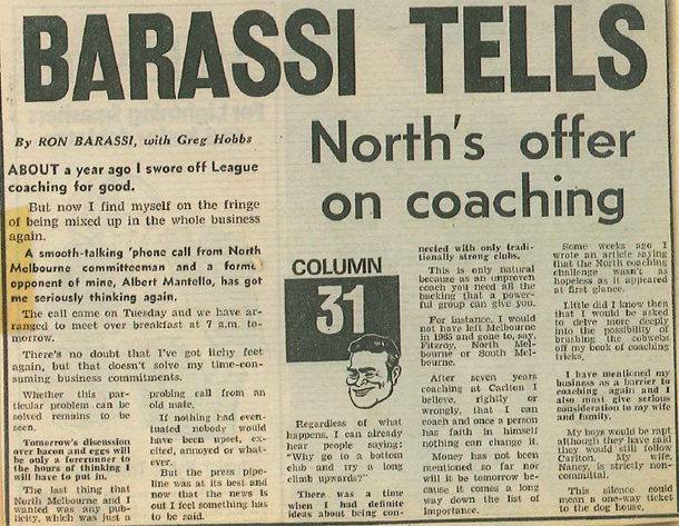 Barassi’s open approach in the media is unrivalled in the present day, but perhaps even more surprising was the way his contract at North was agreed upon, during a meeting with administrators Allen Aylett, Albert Mantello and Ron Joseph.