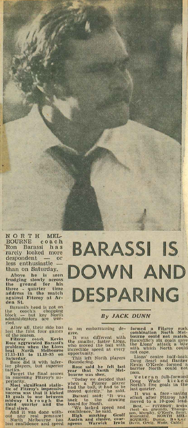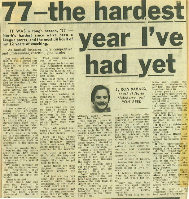 North missed the finals in Barassi’s first season with 11 wins, but a season later played off against Richmond in the Grand Final.